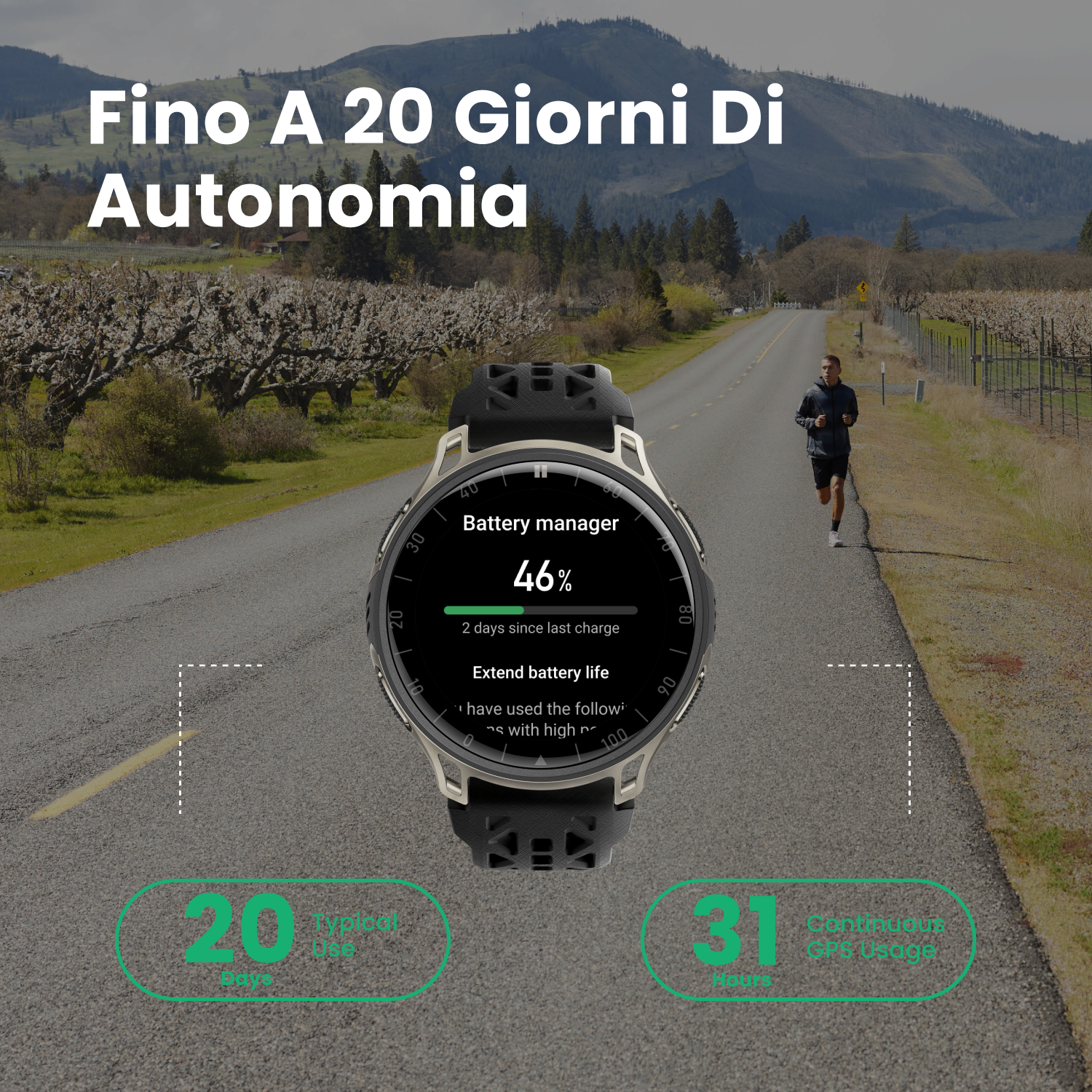 Durata dell'uso continuo del GPS (modalità Risparmio energetico; singola banda, GPS a basso consumo): i servizi in background come frequenza cardiaca, stress, sonno, disconnessione Bluetooth dal telefono e schermo spento (disattivazione dei promemoria di attività, alzata del polso per accendere lo schermo e clic singolo per accendere lo schermo) sono disabilitati.